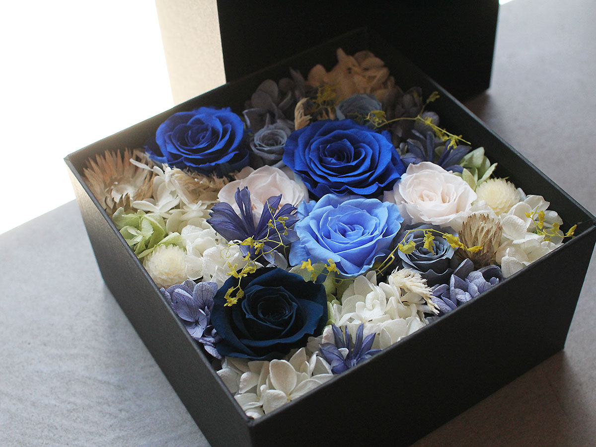 甘さを抑えたクールで洗練されたデザインは、大切な方への特別な記念日、昇進・栄転の御祝い、あるいは男性へのフラワーギフトとしても格別な印象を与えます。あなたの想いを、夜空に輝く青い奇跡に託して贈りませんか。