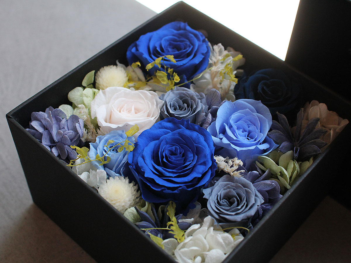 ジュエリーケースを思わせる重厚なマットブラックのボックスは、夜の静寂を思わせるキャンバス。その中に、主役である濃紺からインディゴブルー、そしてスカイブルーへと変化する、神秘的な青のプリザーブドローズを贅沢に咲かせました。